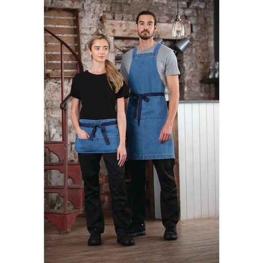 The Southside short-length bib apron in denim blue offers a modern, street-food style look and provides reliable protection for the front of house ...